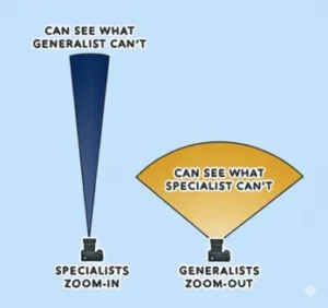 - breadth of experience, almost never in specialty;