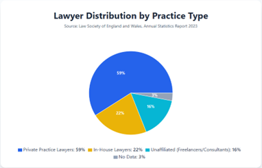 Data published by the Law Society in November 2025, reflecting statistics from 2023, shows the number of lawyers at law firms has fallen from 69% in 2014 to 59% in 2023, while the in-house segment has risen to around a quarter of the profession. Curiously, unaffiliated (often freelancers/consultants) have doubled to 16%, growing at a faster pace.[1]